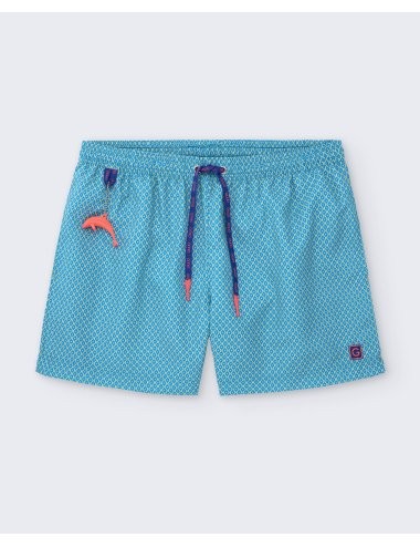 Bañador para chico de secado rápido y dibujo repetitivo en verde turquesa con fondo azul claro.