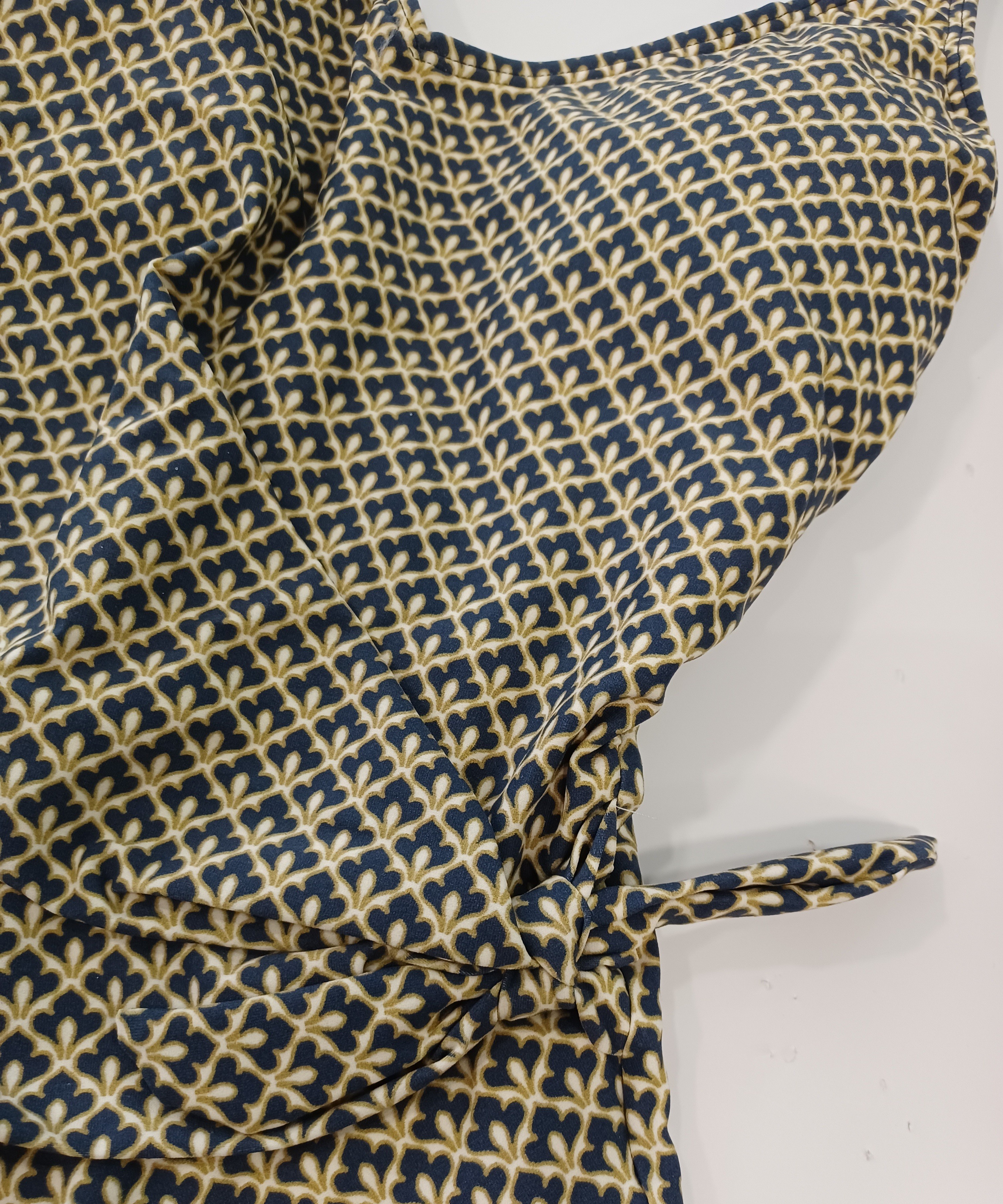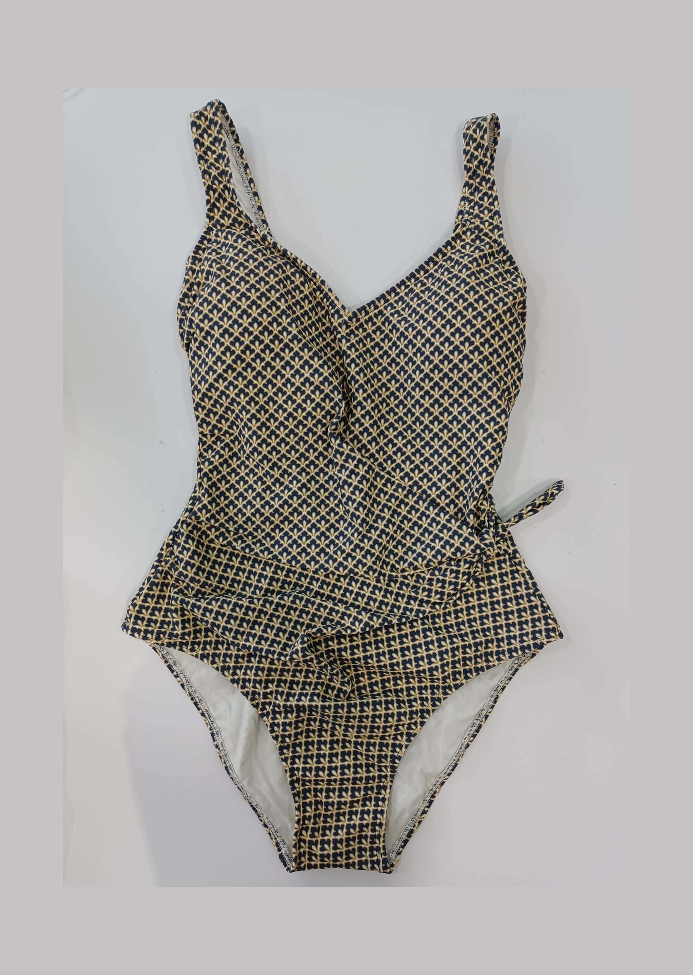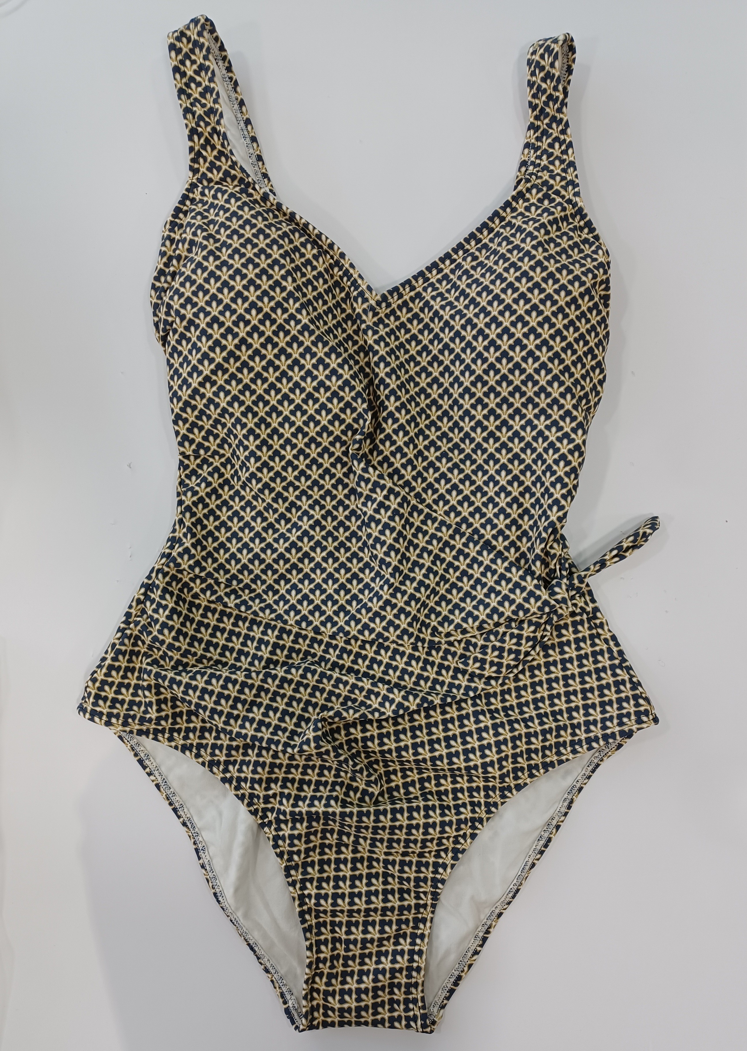 Bañador cruzado con nudo en un lateral que disimula las curvas molestas, estampado pequeño vintage en verde, marino y crema.