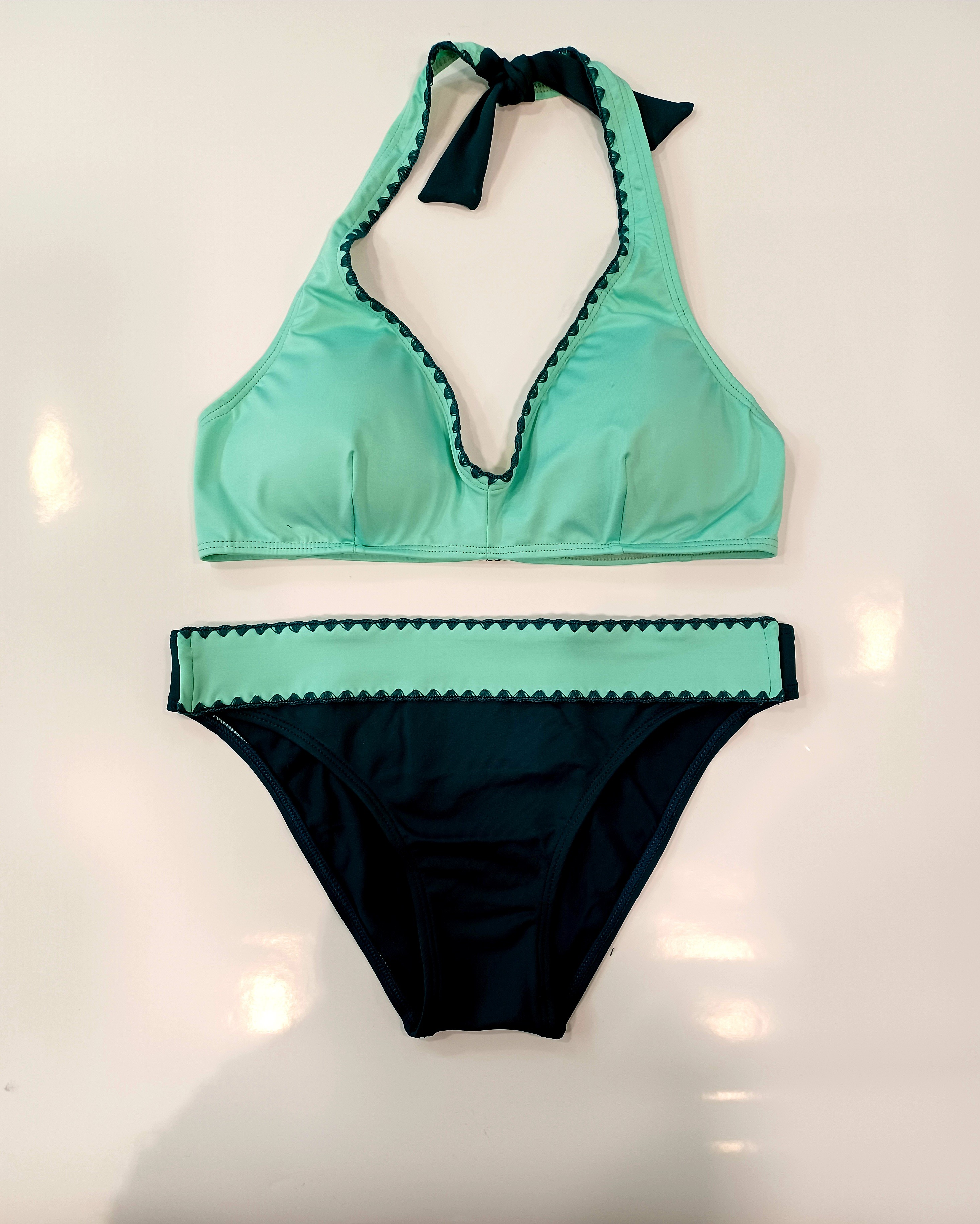 Top triangular con copas de foam extraíble y escote halter que anuda al cuello, braguita de corte medio con un cinto decorativo.