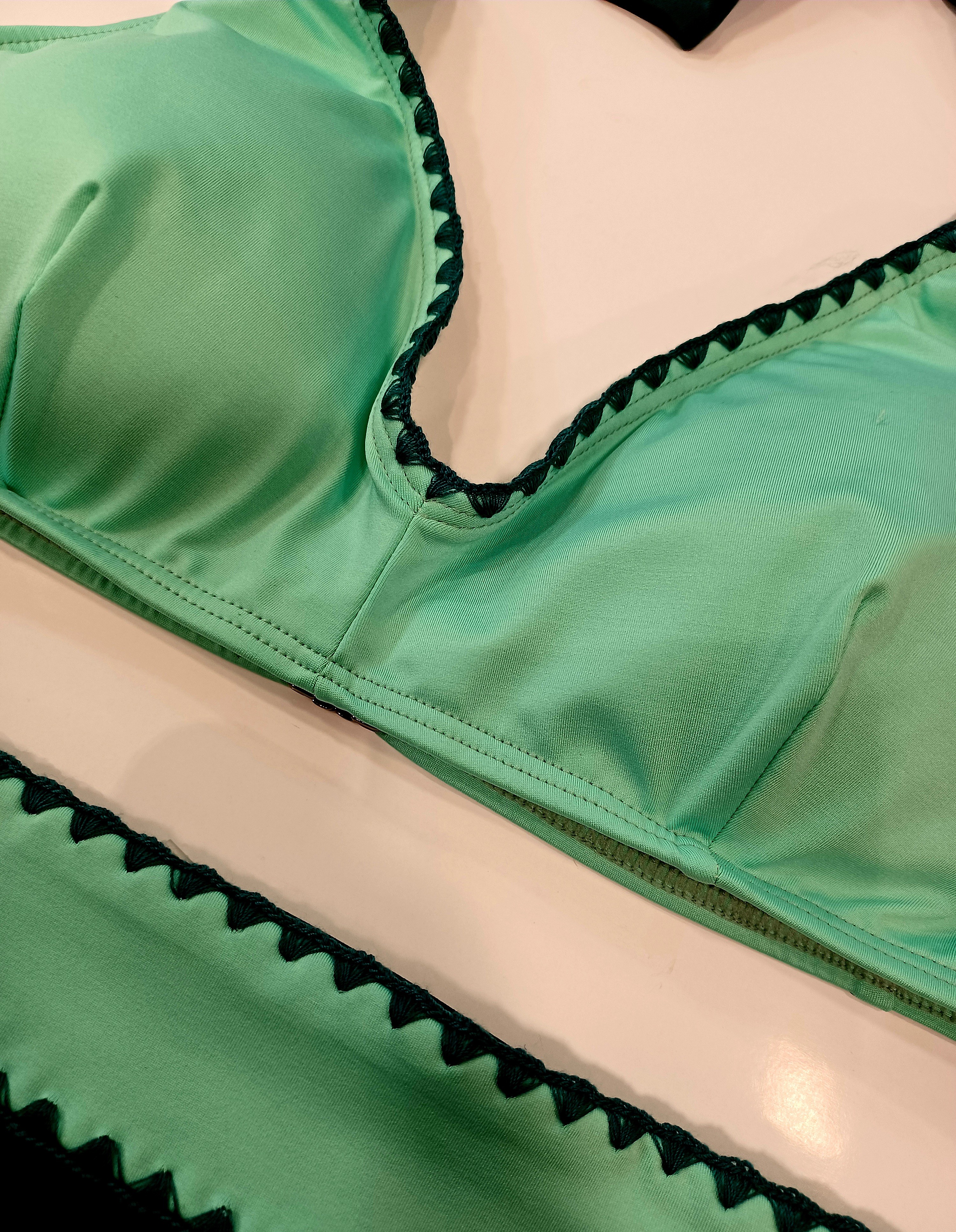 Elegante y minimalista conjunto de baño en una combinación de tonos lisos verdes, con un ribeteado de crohet a juego.