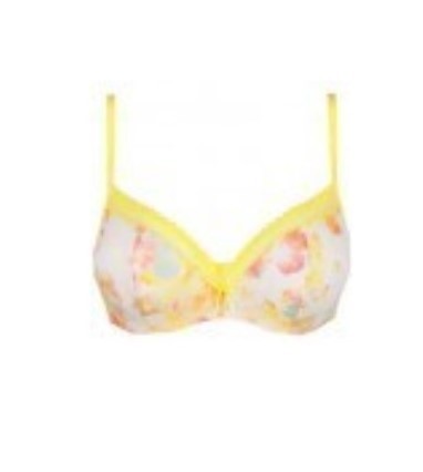 Bonito sujetador con aros y sin cazuela. Está confeccionado con una microred estampada de flores en un fondo liso "Ananas", enriquecido con una banda de blonda en el contorno y con hombreras a tono amarillas. El tejido exterior va en una pieza aportando elegancia. THIERRY de Marie jo.