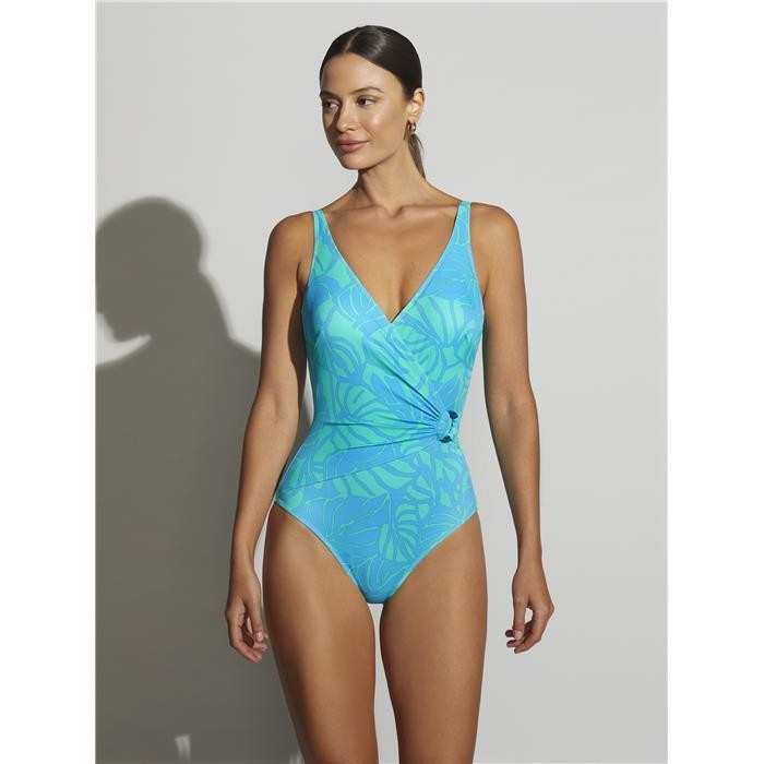 Bañador cruzado en la parte delantera y espalda redondeada media, tirantes continuos.