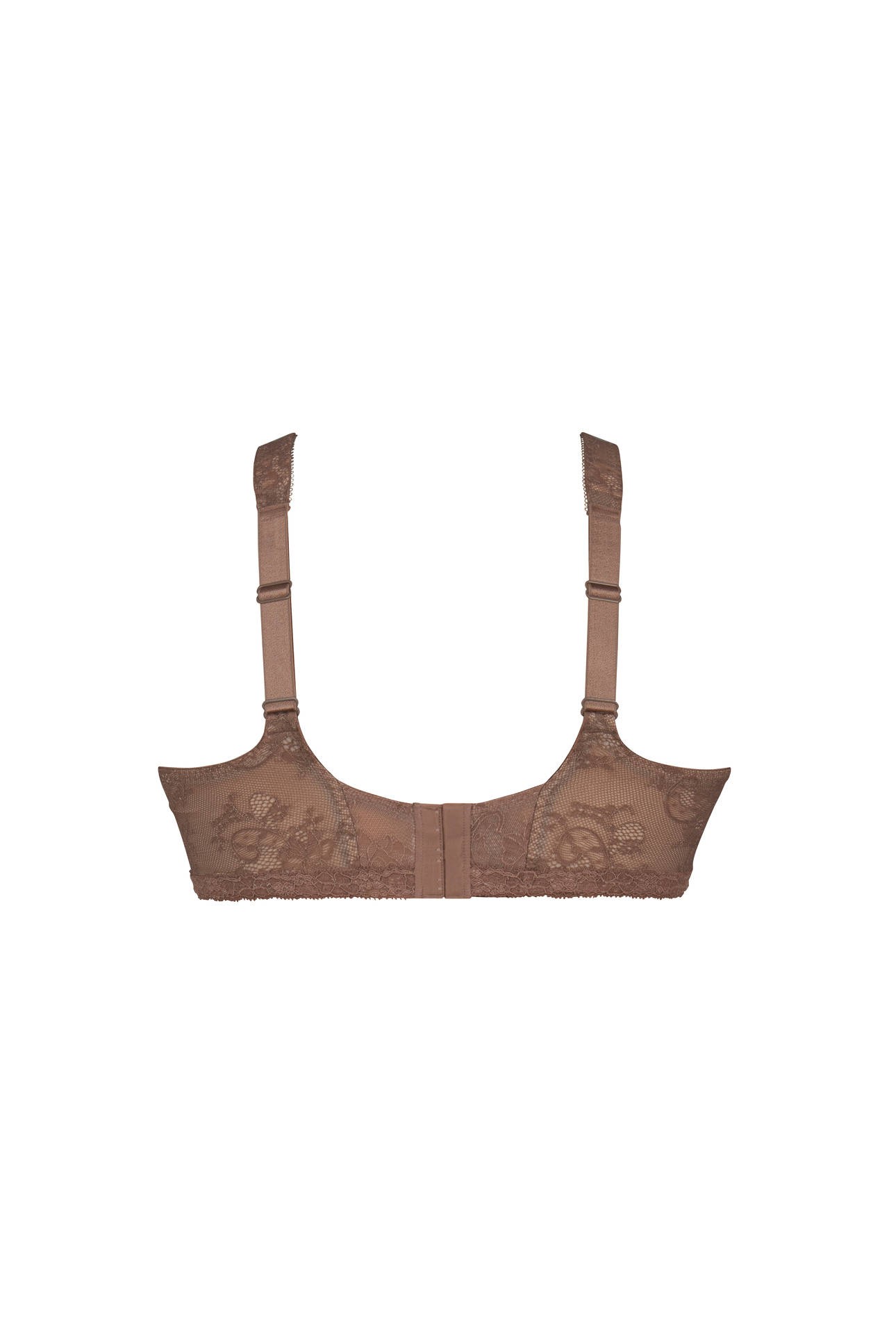 Sujetador con aros realizado totalmente con puntilla, forro y refuerzo total en el interior, espalda corte chimenea, tirantes anchos con almohadilla anatómica regulables en altura, copas estructuradas en 4 piezas.