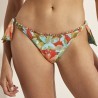 Bikini turquesa con estampado de flores a pinceladas en tonos naranjas.