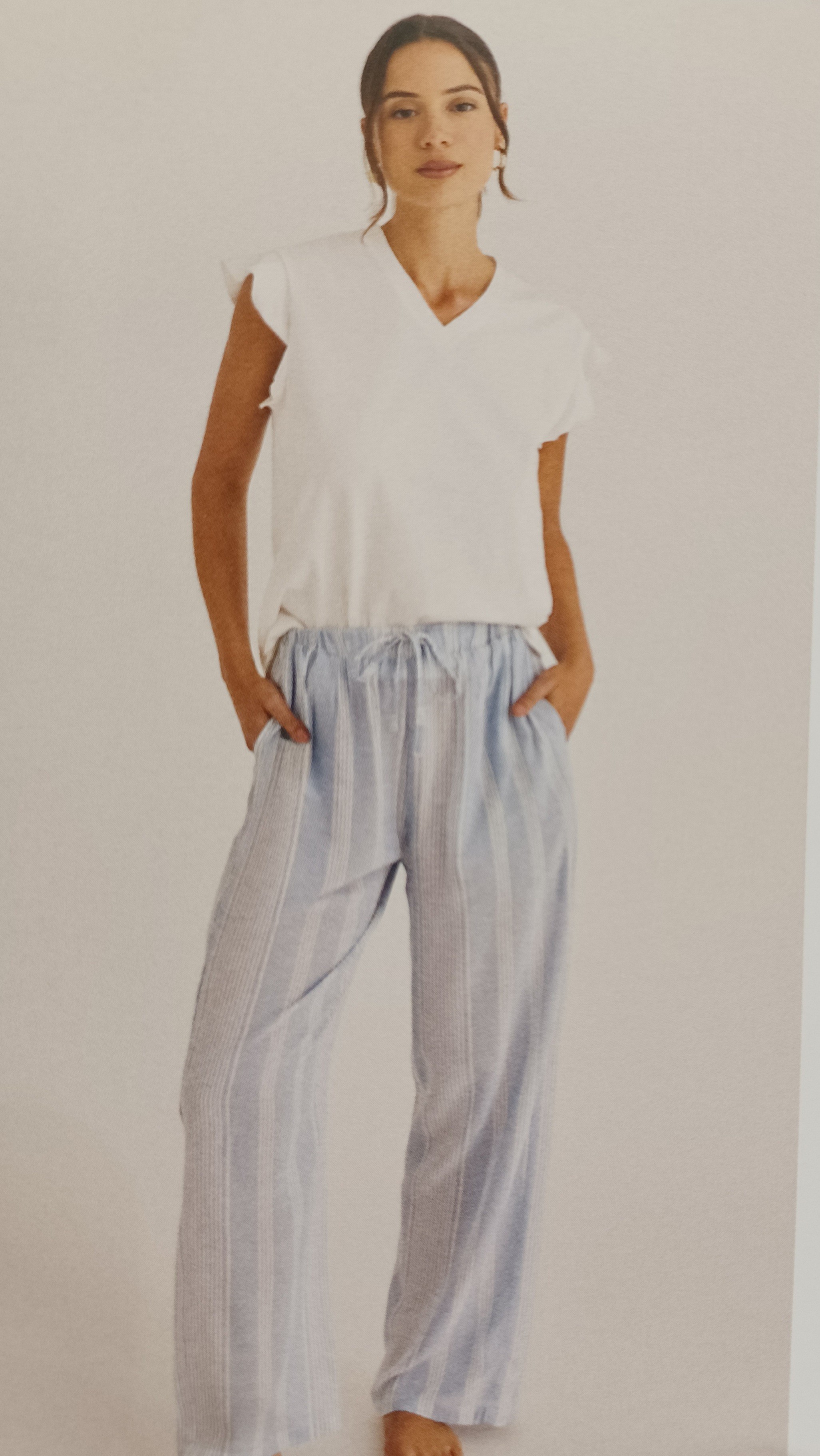 Pantalón 100% viscosa, fluido y fresco en color azul bebé con rayas blancas.