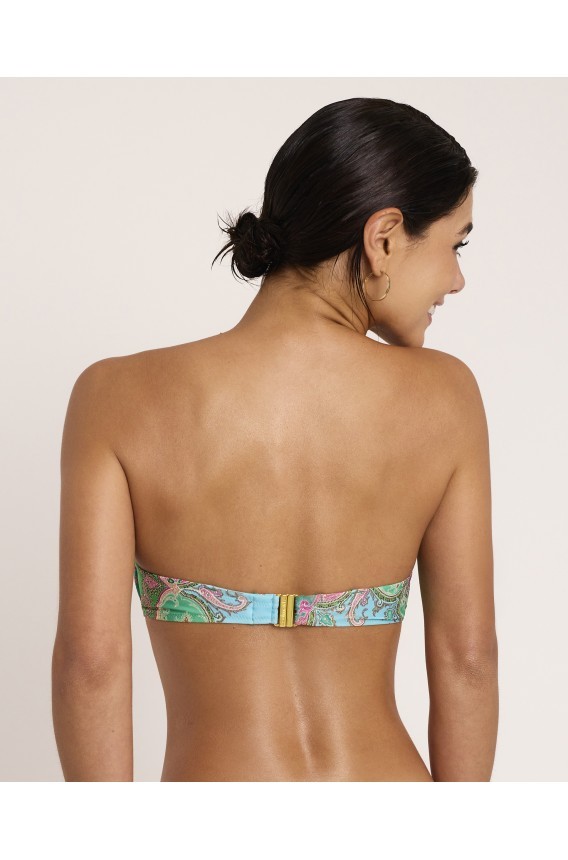 Top de bikini bandeau con aro y copa. Con tirantes extraibles. Con un estampado que respira libertad. Su estética bohemia evoca viajes, sensaciones y belleza natural. Inspirado en lo artístico y lo sensorial, este diseño celebra la feminidad libre y expresiva, donde lo desestructurado se convierte en identidad.