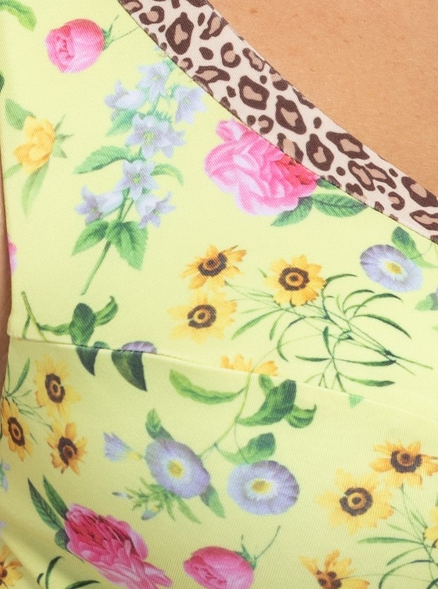 Bikini de cortina verde lima con estampado floral y ribetes animal print.