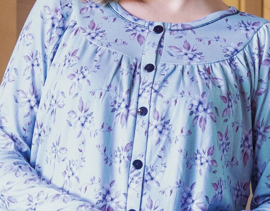Camisón de manga larga con botones y frunce en la pieza de todo el escote, largo de 95 cm.