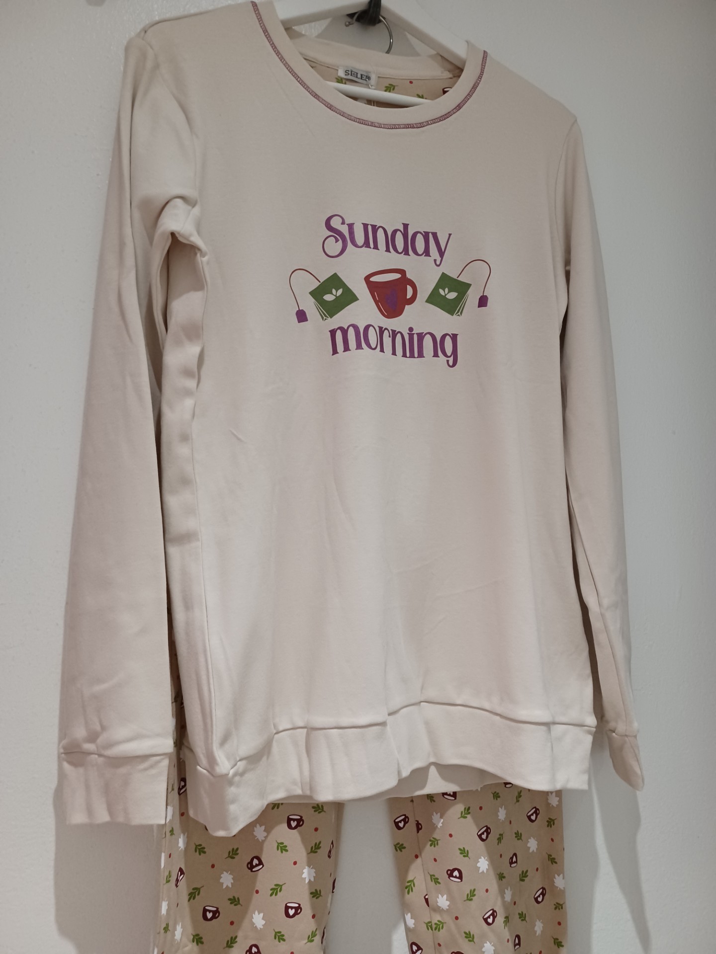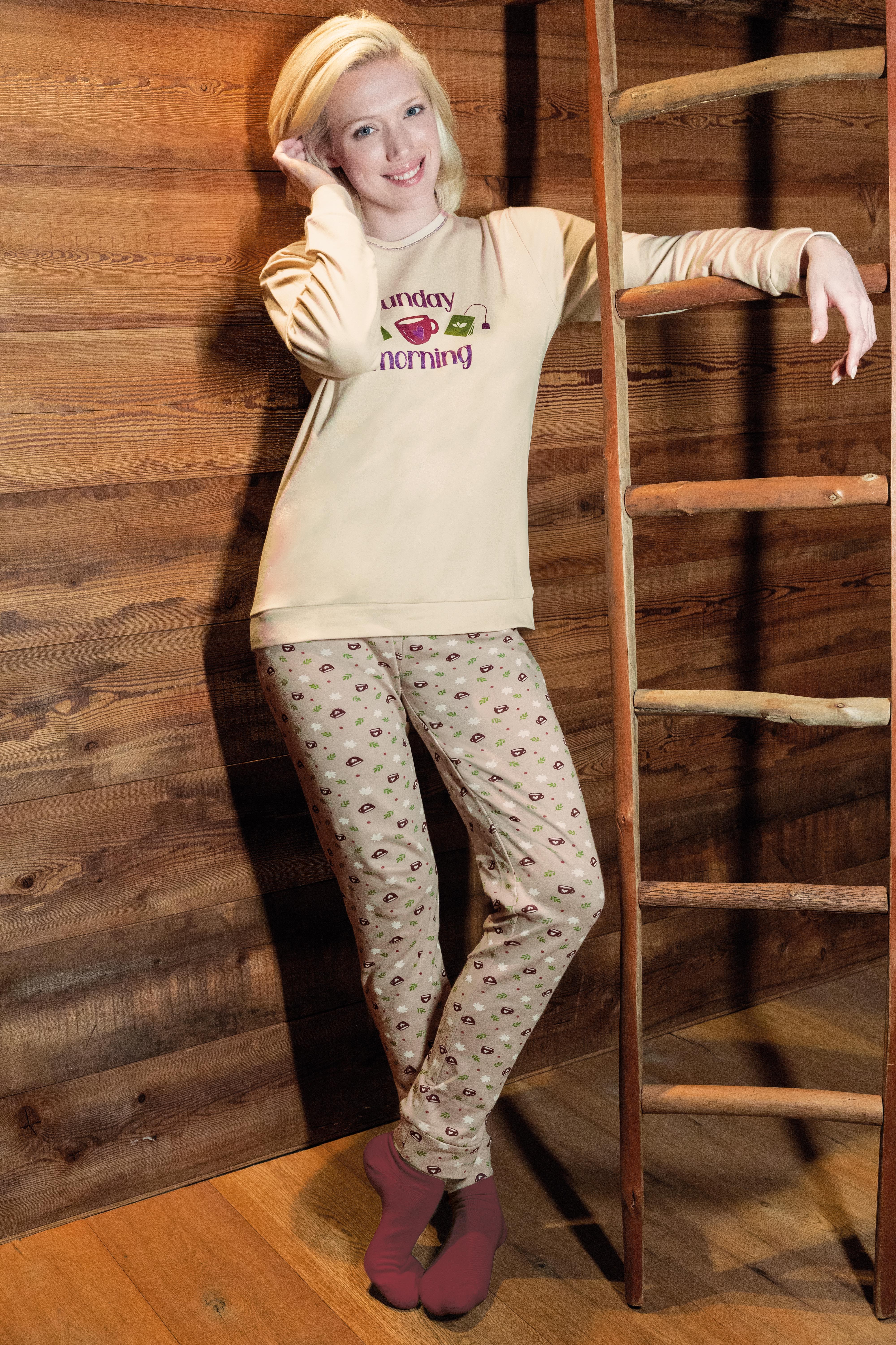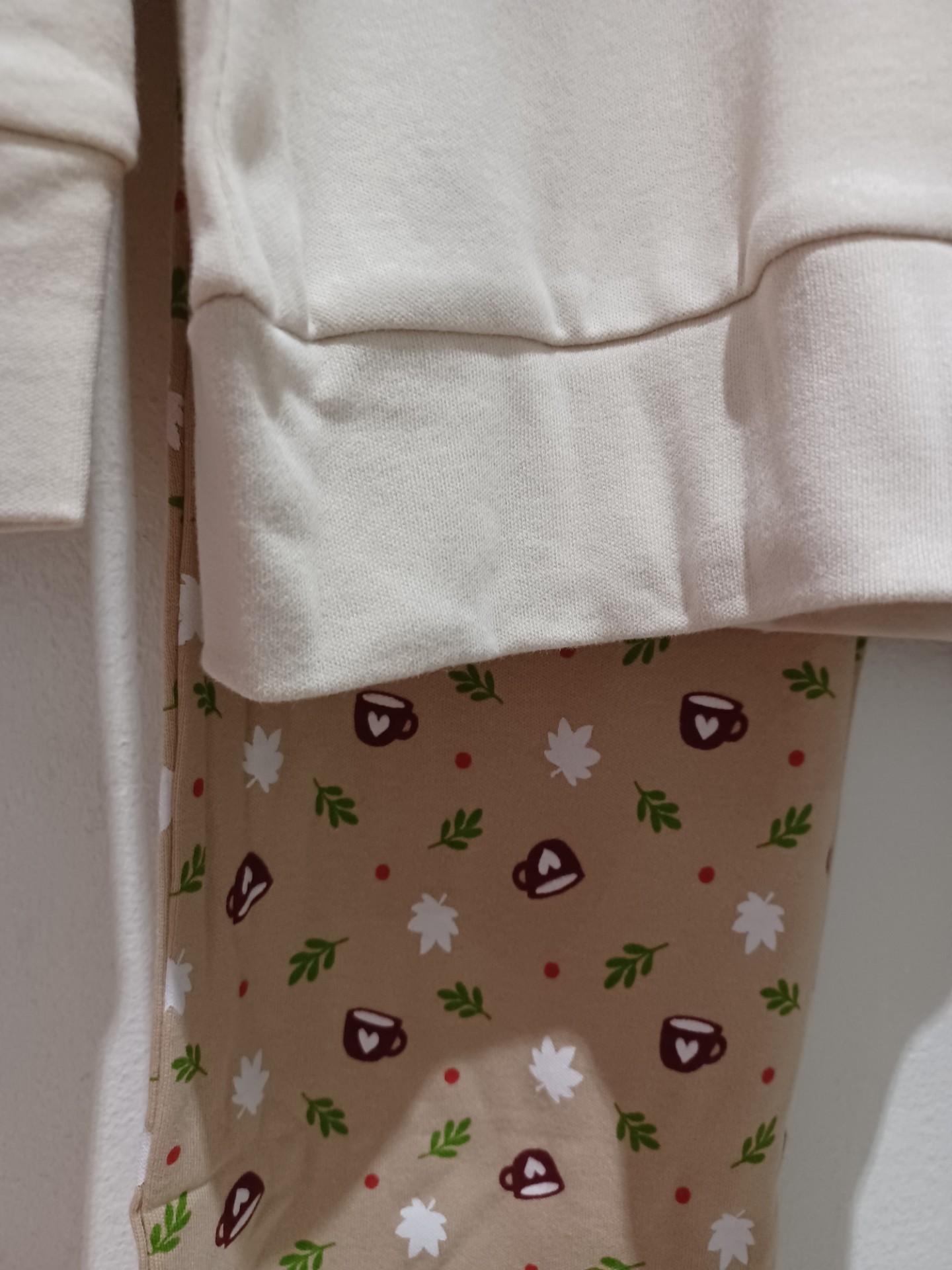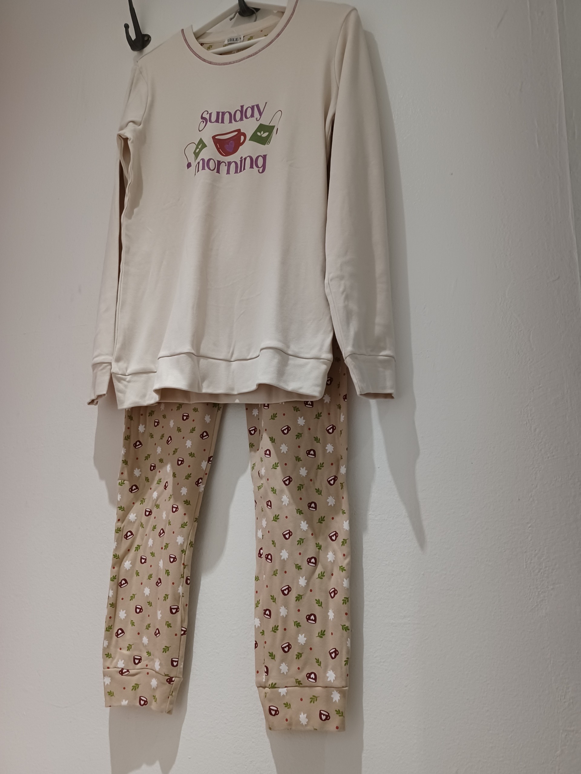 Pijama con pierna y manga larga con puños, color beig con dibujos otoñales.