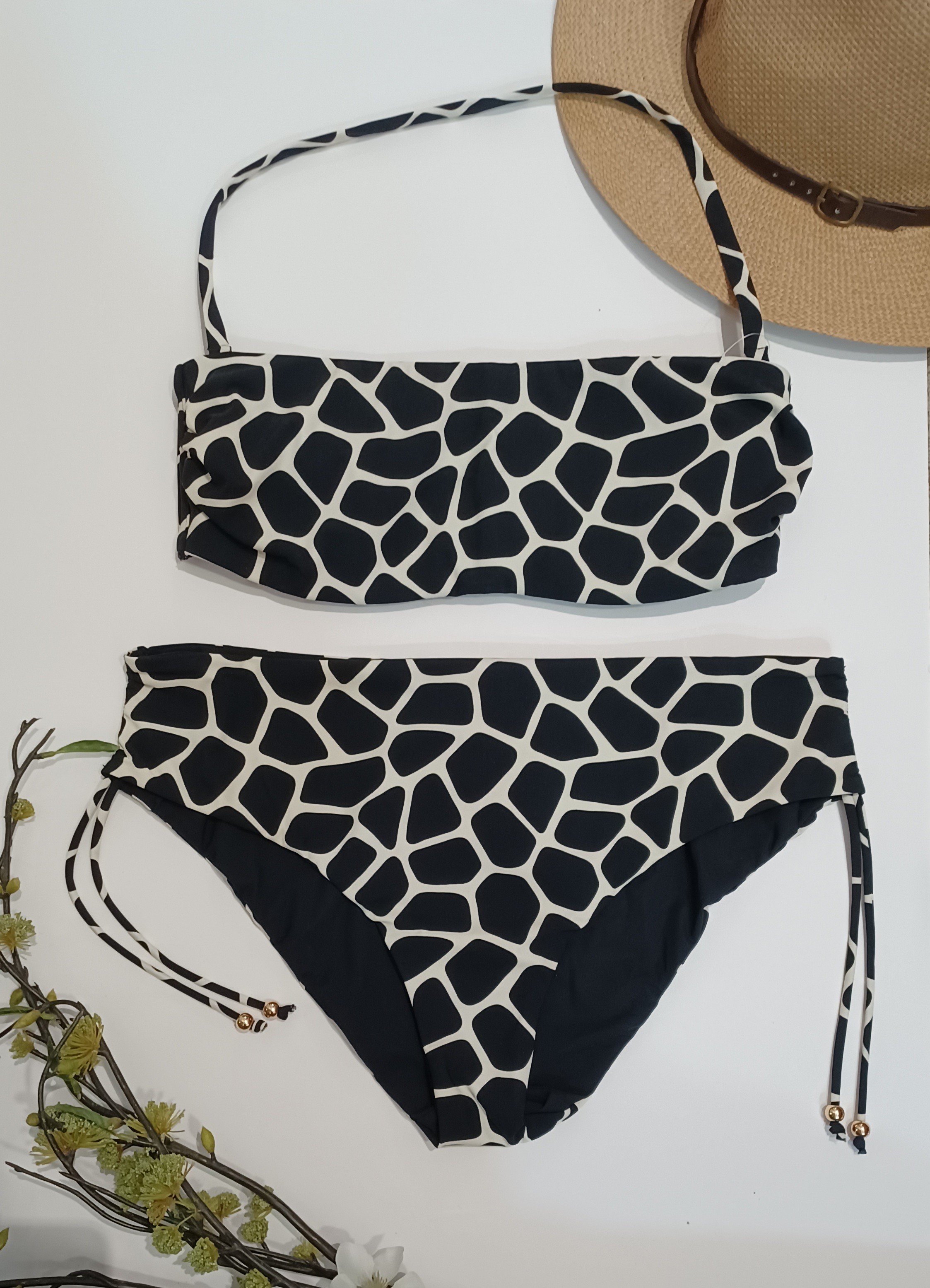 Top de aros y refuerzo interior, braguita reversible, escotada con lazos en la cadera.
