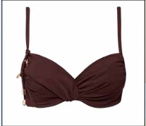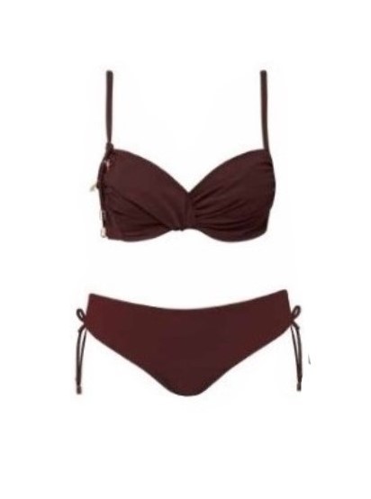 Bikini liso en color marrón , estética minimalista con toques sofisticados de inspiración marina transformadas en joyas doradas.