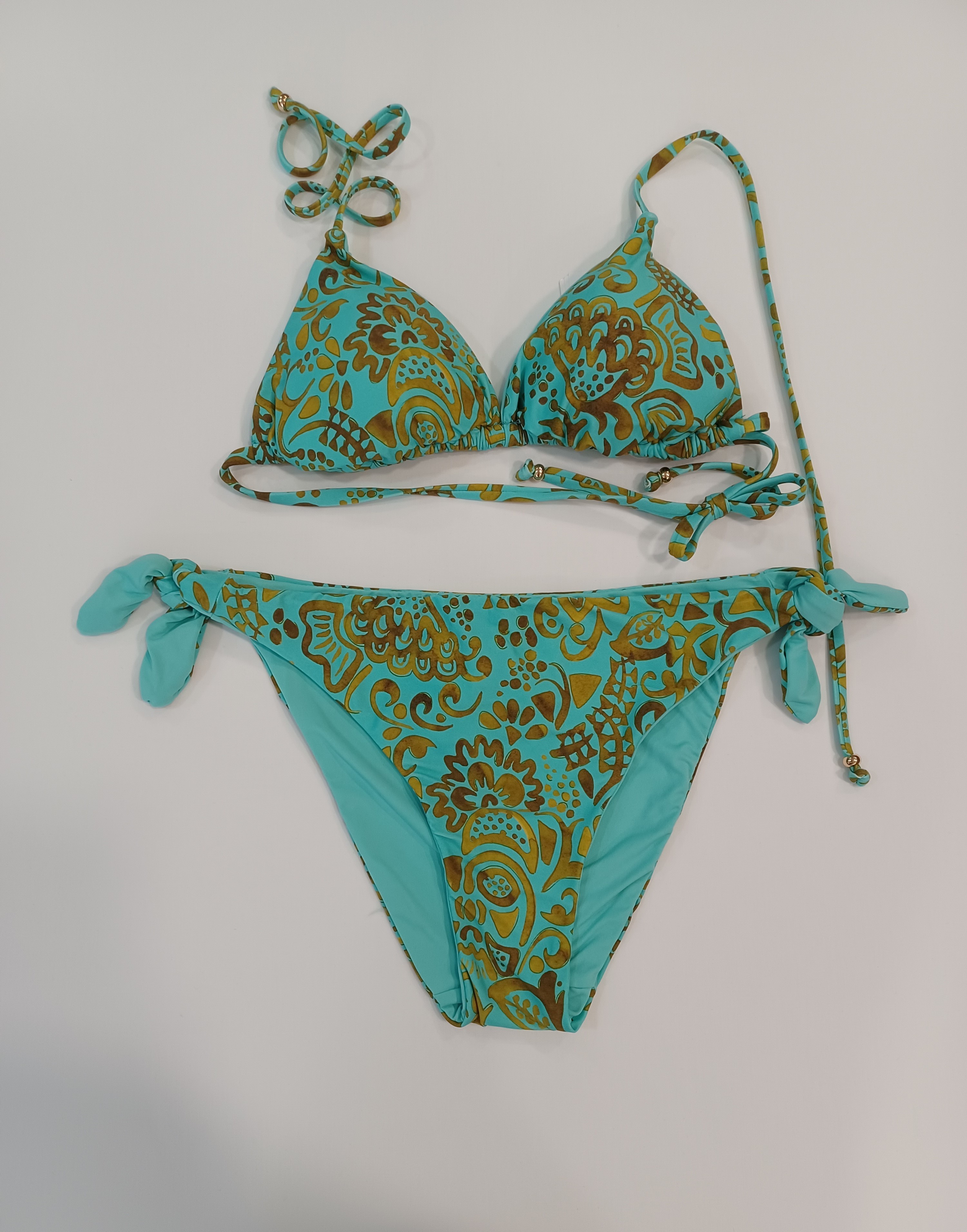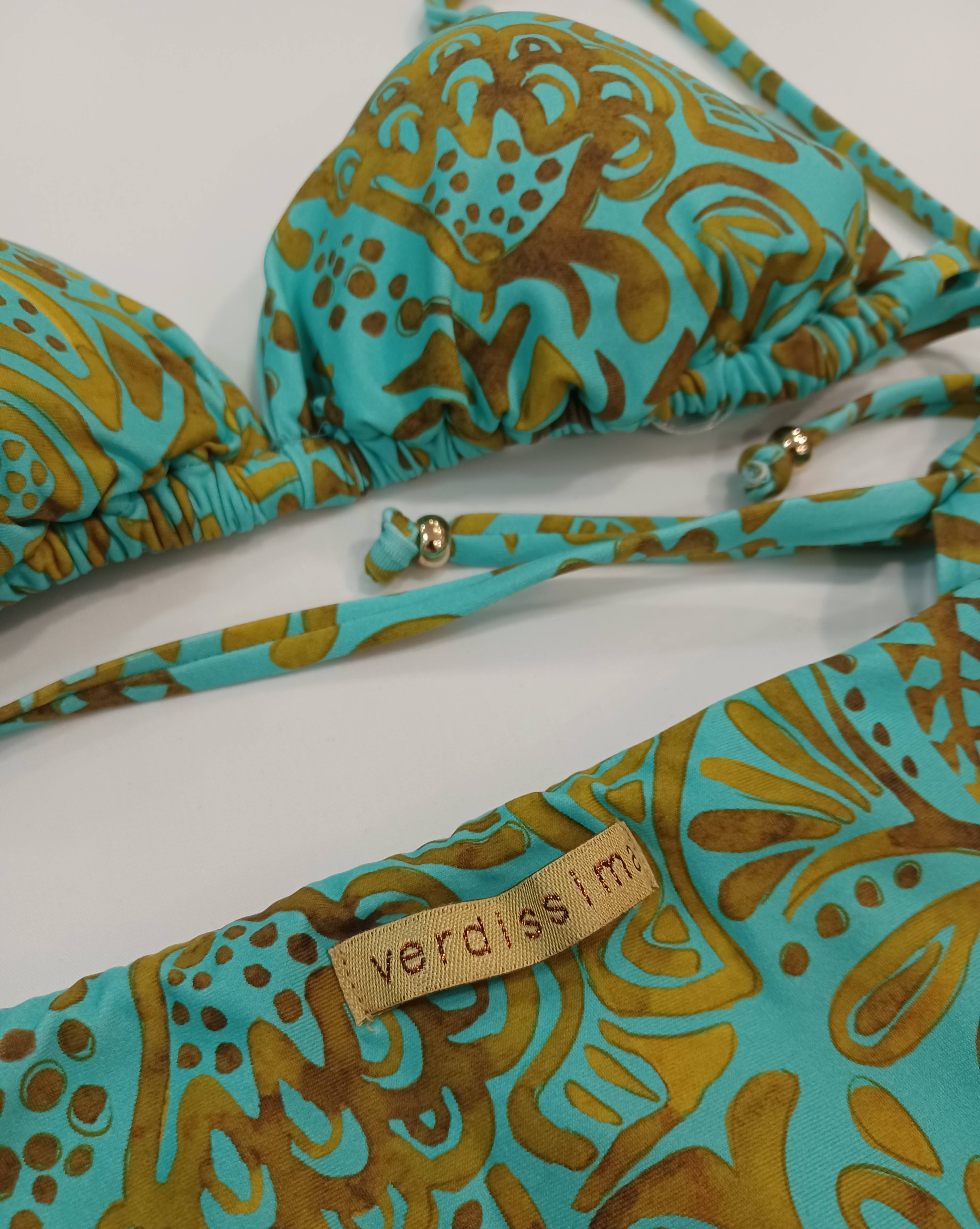 Estampado en tonos ocres y dorados sin brillos sobre un fondo turquesa.